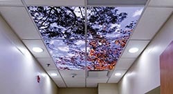 Ceiling Tiles & Lighting Luminaires Eliminate Boredom. Sereneview overheads offer a calming, scenic view of Nature for patients lying in exam chairs or in a bed. Overheads can be configured to fit any ceiling grid layout, no matter how big you want to make it. Patients sitting in a chair looking up, waiting for drilling to begin, are stressed waiting for the pain they are about to feel. Sereneview Scenic Overheads will calm and relax your patients for a better experience.